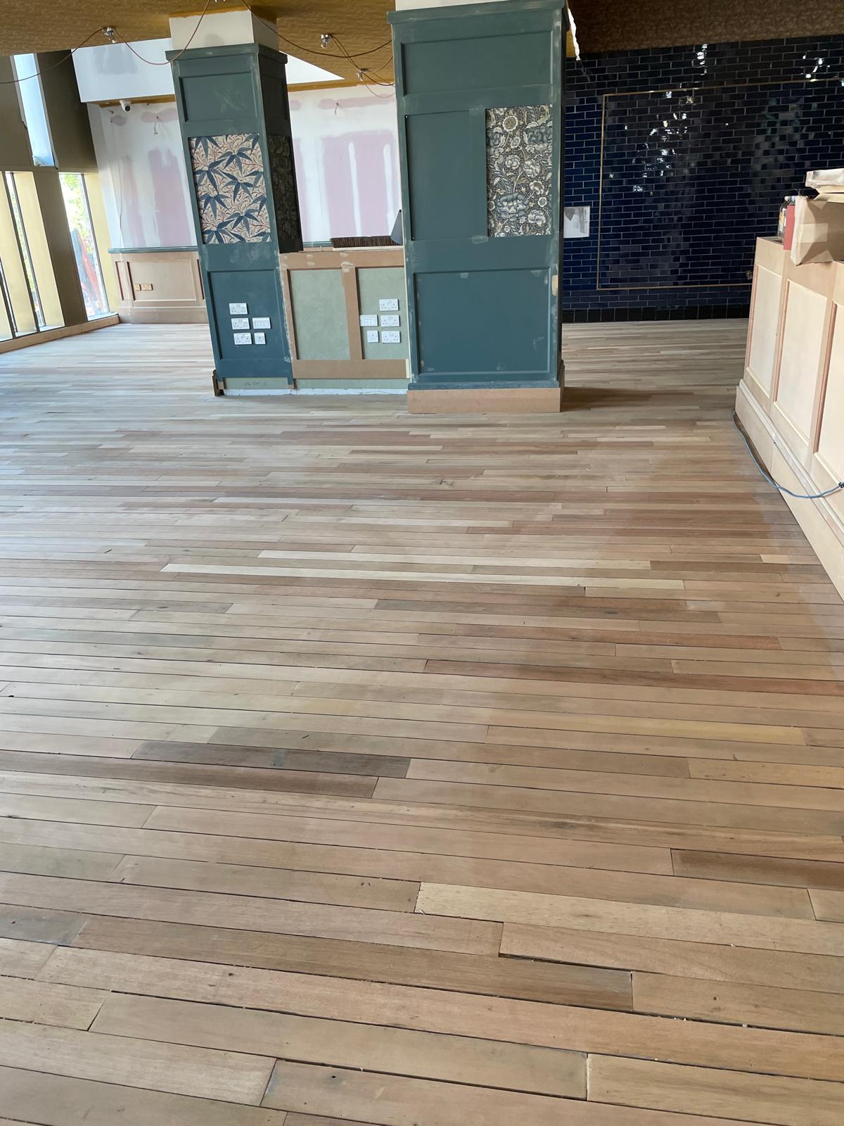 Using our special sanding techniques and using Lagler floor sanders, we carefully refined the surface of the flooring, ensuring a perfectly smooth and even surface and finish. Following this, we applied a high-quality Bona lacquer that brings out the natural grain, adding depth, warmth and a durable protective layer to the wood surface. The result is a stunning, long-lasting finish that elevates the entire interior, making it even more inviting for the customers.